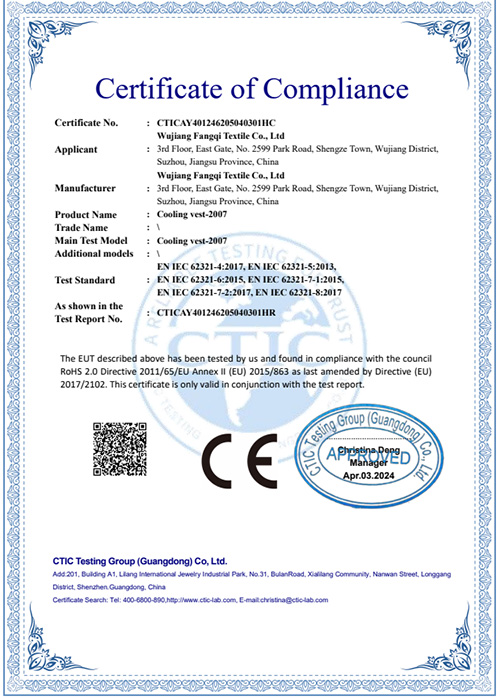 Çeşitli ortamlar ve aktiviteler için doğru dış mekan soğutma yeleğini seçmek, rahat kalmanıza ve yüksek sıcaklıklarla ilişkili riskleri azaltmanıza yardımcı olabilir. Wujiang Fangqi Textile Co., Ltd'nin ürünleriyle, olağanüstü soğutma performansı, konfor ve güvenilirlik bekleyebilirsiniz. Bir sporcu, açık hava işçisi veya maceracı olun, soğutma yeleklerimiz sizi serin ve en iyi performans gösterecektir.